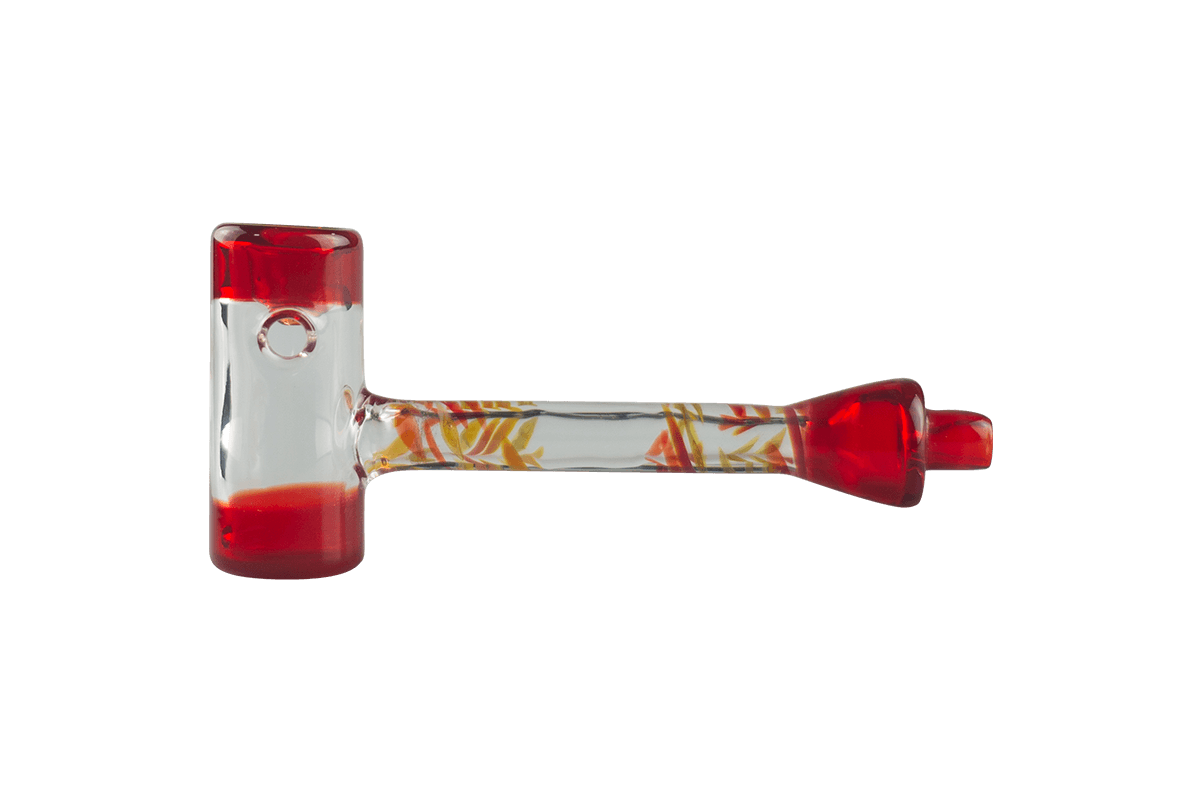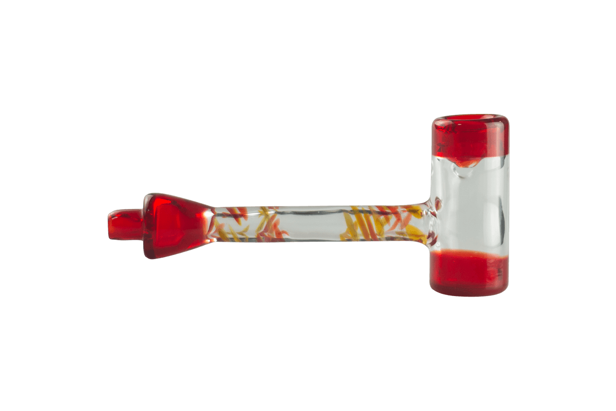 This fun Red Swirl Hammer by Biting Glass is a stylish everyday pipe option! Featuring a slim barrel accented by a long mouthpiece with sections of swirling red, yellow and purple. This sleek pipe was made here in Denver Colorado and features a flared mouthpiece for some extra style.
