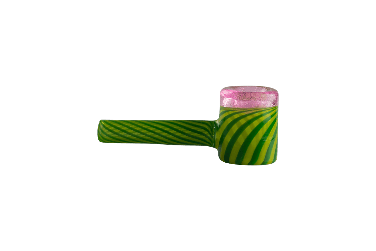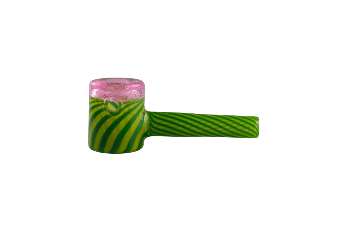 This beautiful Watermelon Mini Hammer Pipe by Technicolor Tony features a carb on the left side of the bowl. Showing off swirling greens for the body and mouthpiece accented by sparkly pink on the bowl this is an eye-catching glass piece. Made locally here in Denver, Colorado, Technicolor Tony's hand pipes are an awesome heady grab at a great price.