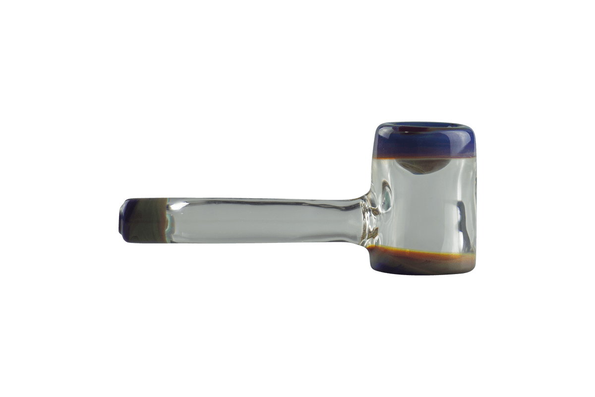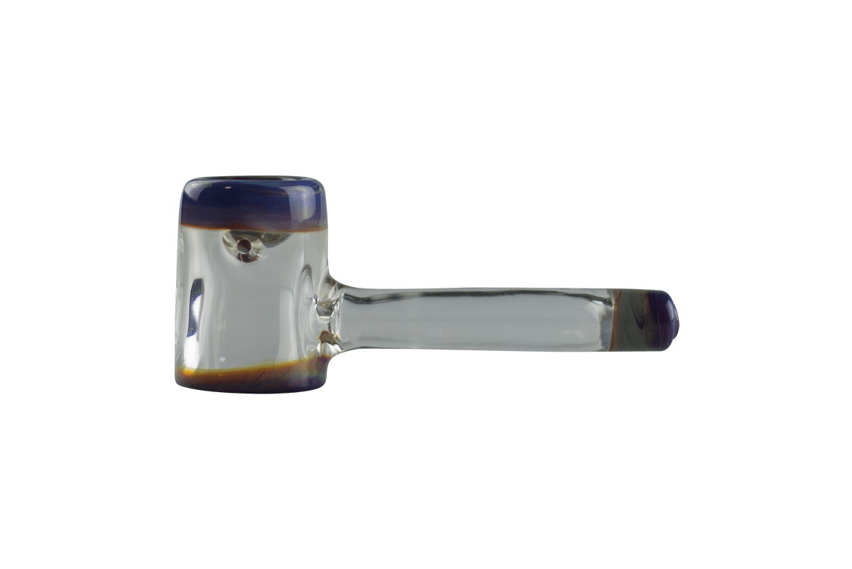 This fun Amber Purple Hammer by Biting Glass represents the artists' first hammer pipe! Featuring thick clear glass for the body and mouthpiece accented by vibrant sections of Amber Purple. This sturdy pipe was made here in Denver Colorado and features a wide stable base allowing the pipe to stand on the table its own.