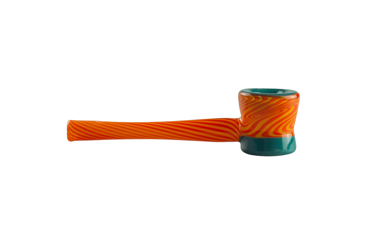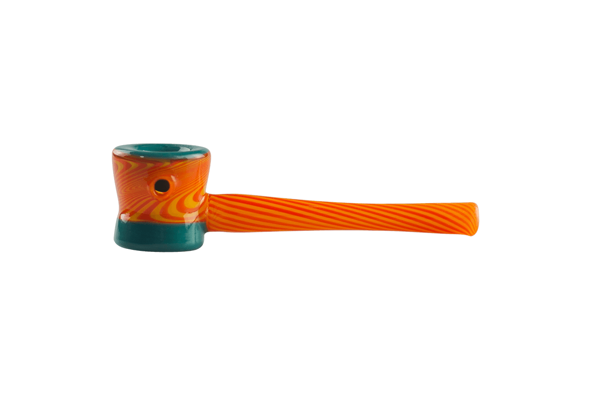 This beautiful Agua Flame Hammer Pipe by Technicolor Tony features a carb on the left side of the bowl. The vibrant Flame striped body features orange and yellow and is accented by a bold teal capped bowl. With a long tapered mouthpiece and flat bottom this is a refined piece sturdy enough for every day use. Made locally here in Denver, Colorado, Technicolor Tony's hand pipes are an awesome heady grab at a great price.