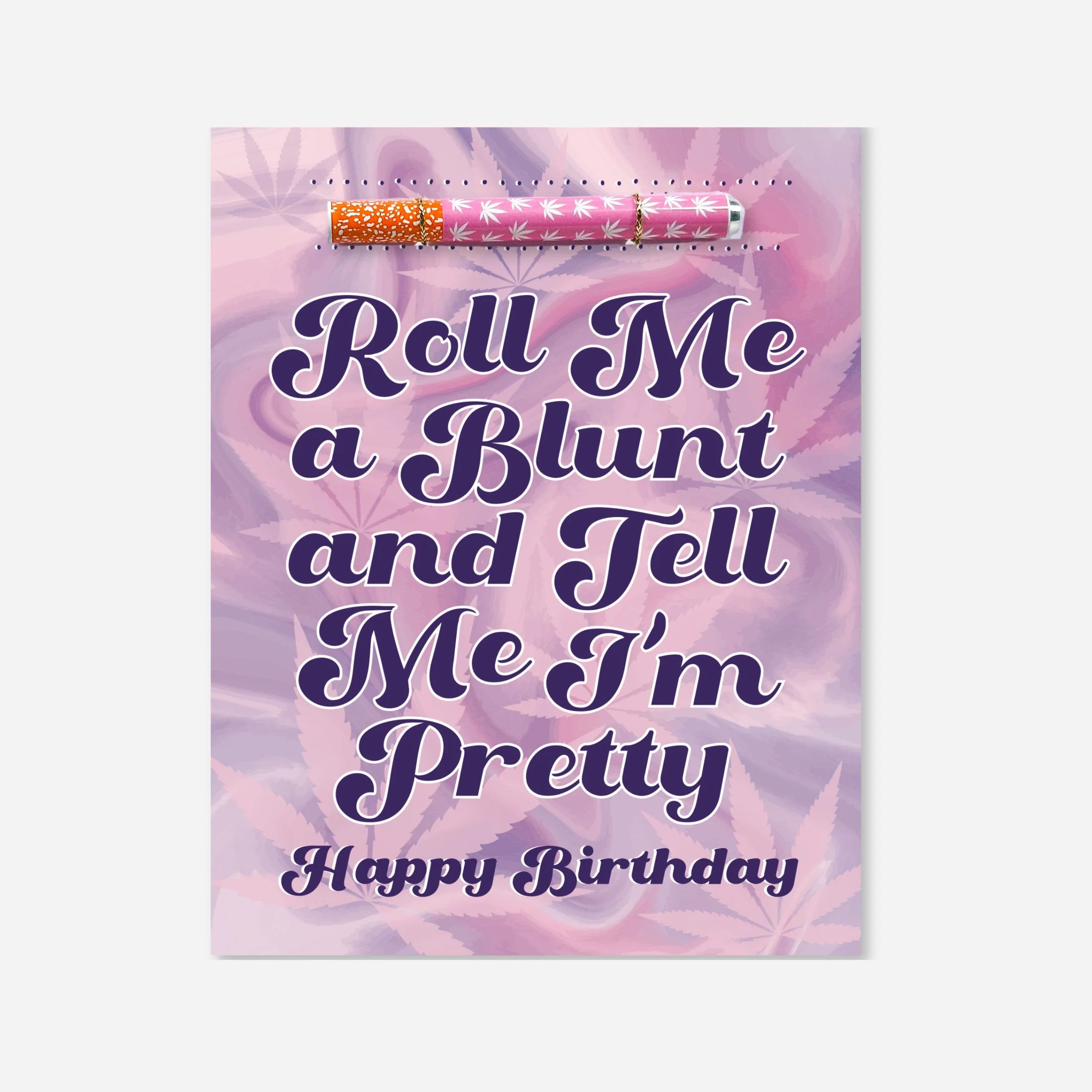 Introducing the "Roll Me A Blunt" Cannabis Birthday Card from KushKards. This uniquely crafted greeting card combines a playful design with a functional twist, featuring a built-in slot to securely hold your favorite joint or included one-hitter you can gift in style!