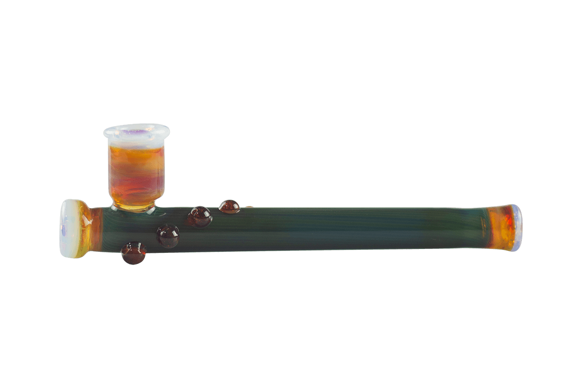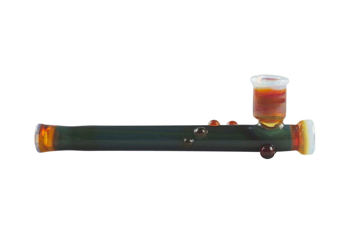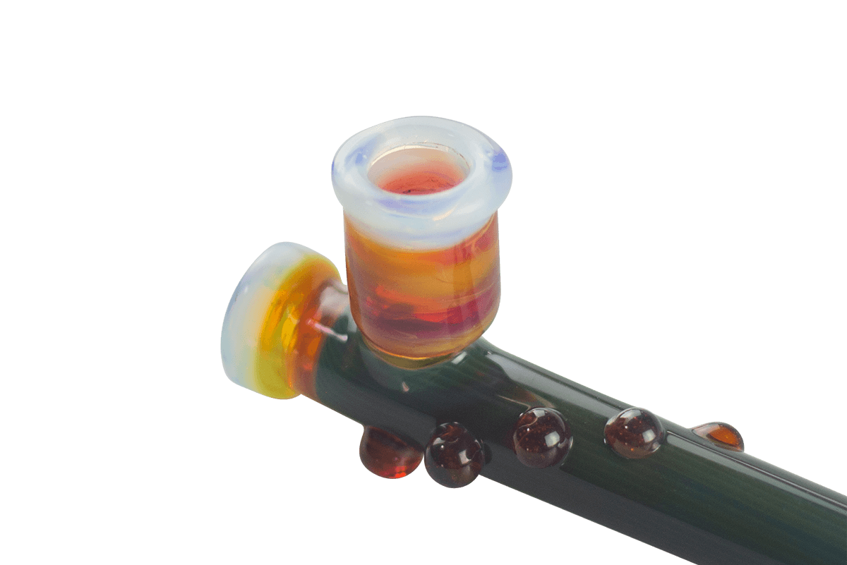 This impressive Green Submarine Steamroller / J-Hook by Technicolor Tony is a great throwback piece. The main tube is made from Experimental Green and is accented by Purple Rainbow capped by Ghost on all three openings. The upper connection is 14mm and it even features two feet so it will sit level on your table. Made locally here in Denver, Colorado, Technicolor Tony's hand pipes are a vibrant upgrade to your glass collection.