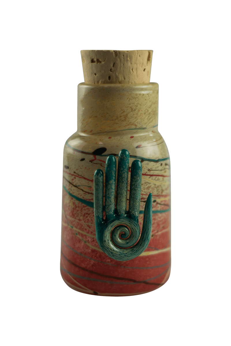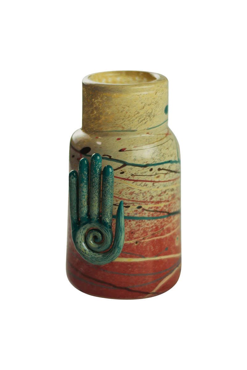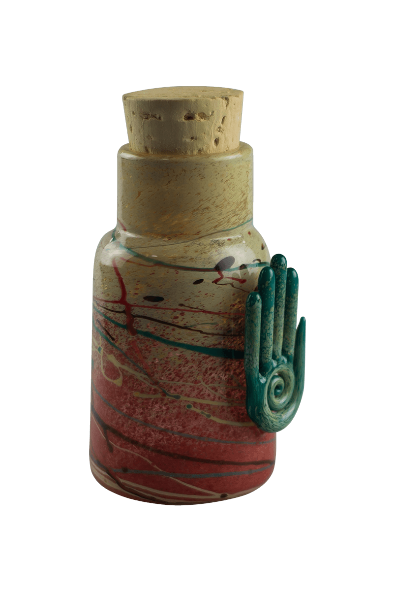 A signature of his distinct style, this Eternal Life Glass Jar by Maze Glass makes you double take that it's actually made from glass. Inspired by native pottery this fun jar features an Eternal Life hand on the front as well as a cork stopper.