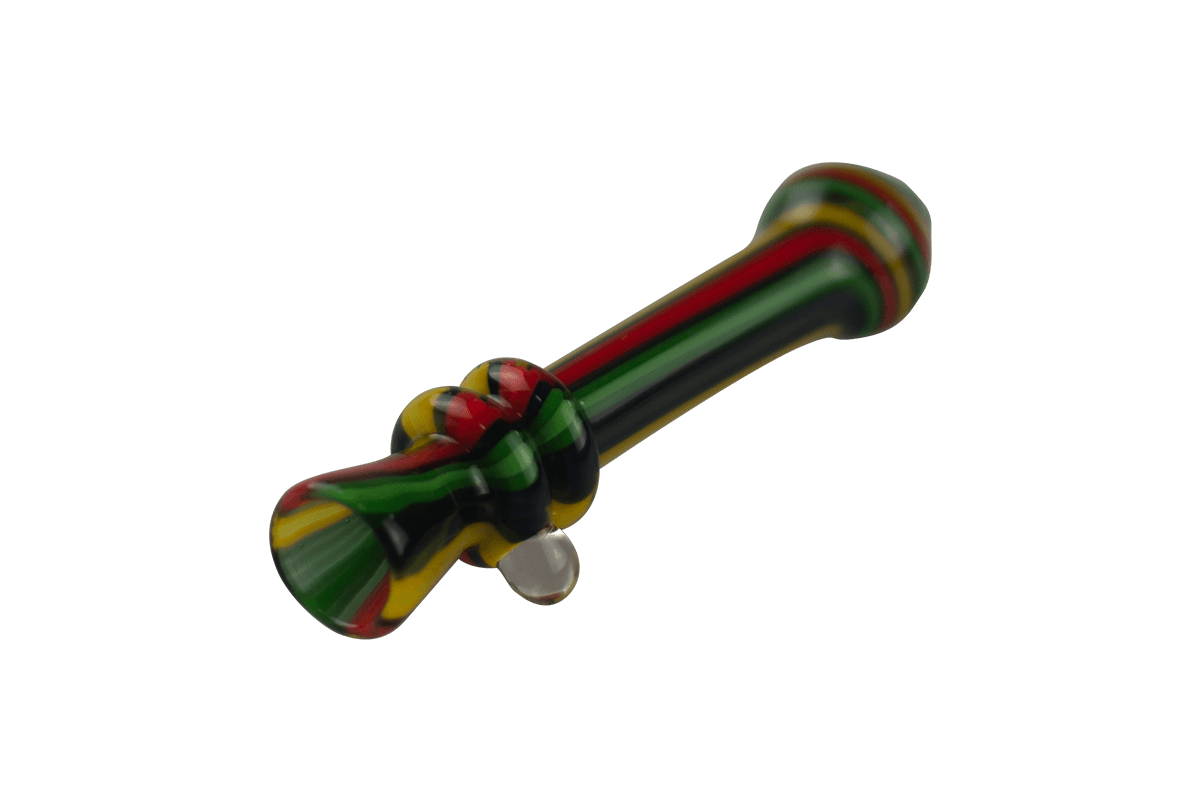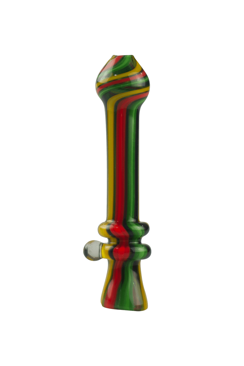 This detailed Rasta Linework Chillum is a discrete and stylish one hitter option. The striped tubing has a fun swirl into the mouthpiece and clean lines throughout the piece. Made in Buena Vista, Colorado, Vulcan Glass Art chillums are an awesome heady grab featuring classic colors and styling.