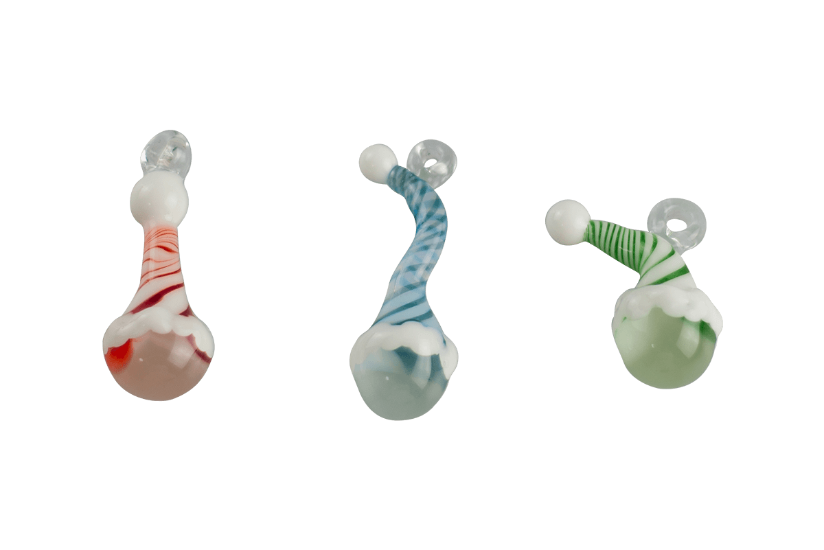 These festive Elf Head Ornaments by Biting Glass are fun handmade glass ornaments to spruce up your holiday decor! Featuring swirling color hats with textured fringe and a white poof each ornament features a clear "head" so you can see inside the hat and watch all the fun colors swirl. Support local glass art with these ornaments made right here in Denver, Colorado.