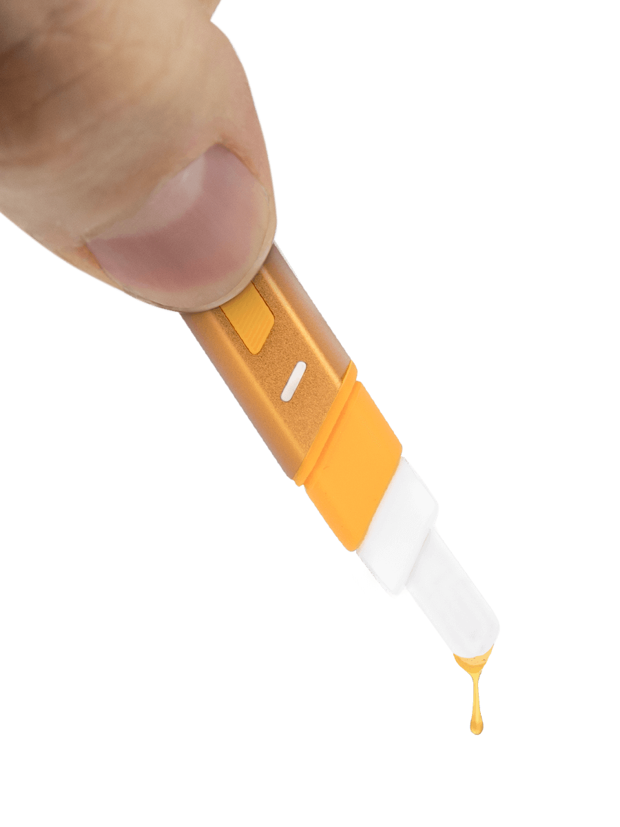 Make sure your Puffco Hot Knife is fully charged before using. Load your concentrates on the ceramic tip and hold over your banger. Then hold the button on the Hot Knife for a couple of seconds until your concentrates neatly fall in your banger.
