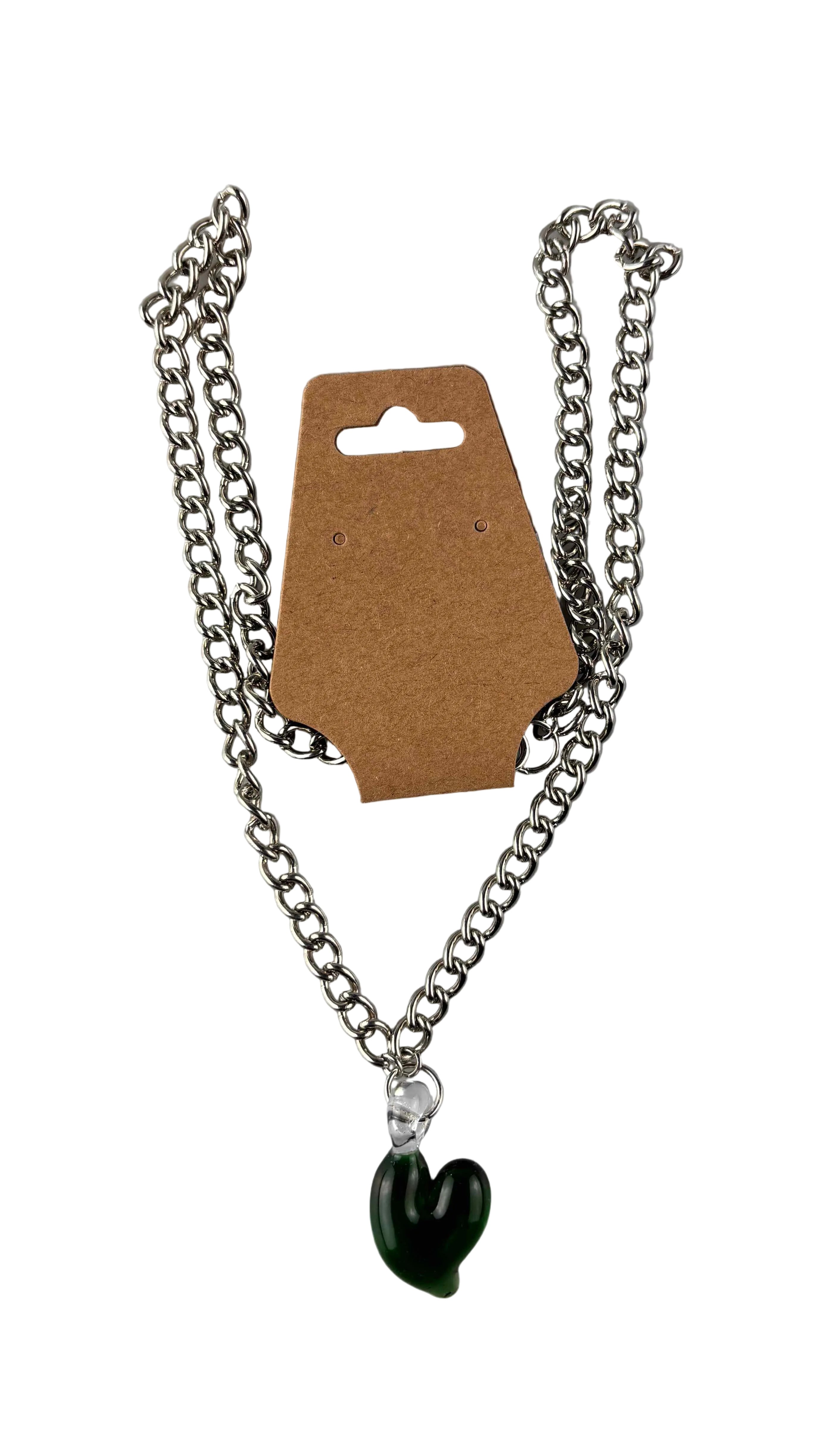 This fun Solid Glass Heart Necklace by Hobbitkraft Glass features a green glass heart on a clear bail attached to a metal chain. Made here in Denver, Colorado this is a stylish piece of hand crafted jewelry.